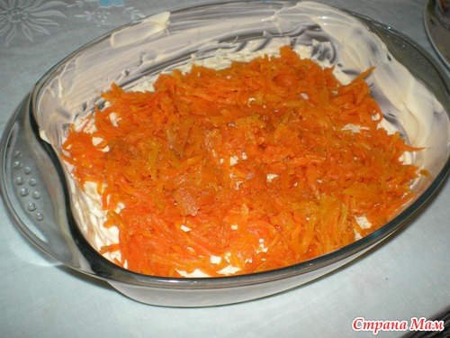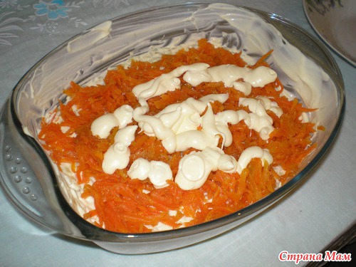 порежем мелко репчатый лук, выкладываем на морковь, не солим и не мажем майонезом.