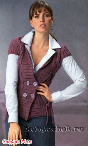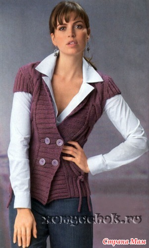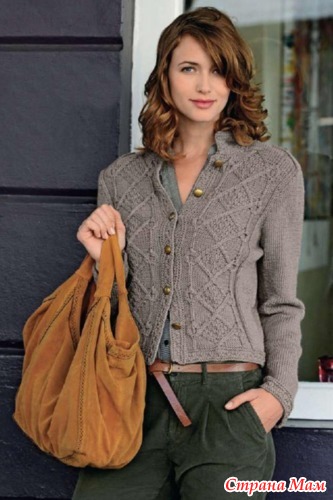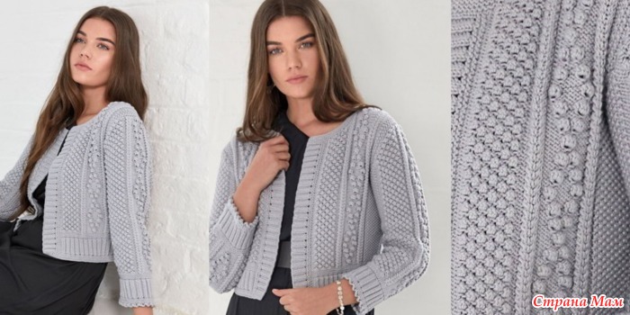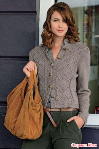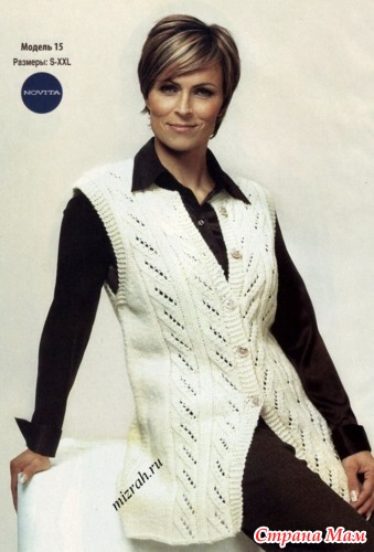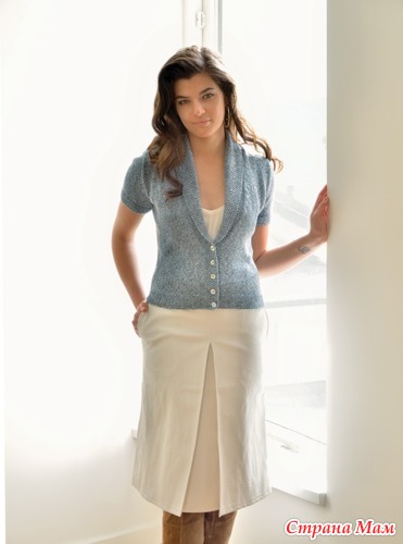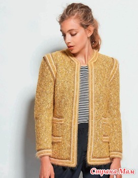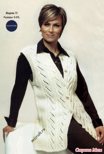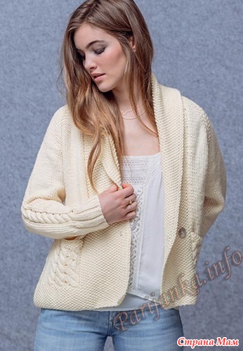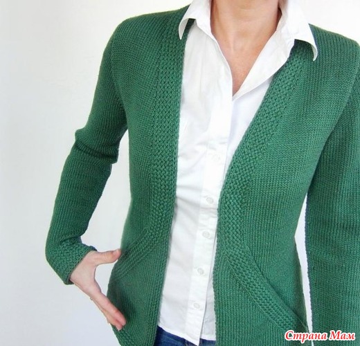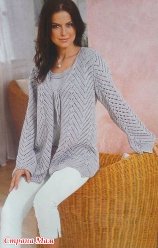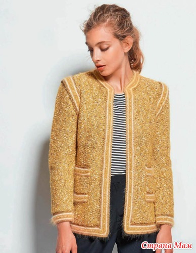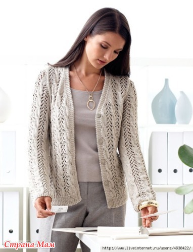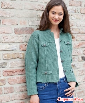 Первое, все хорошо знают модели для офиса из ткани. Поэтому смотрите не на фото готовой вещи, а на ее выкройку. Обычно требуется четкая линия плеча и именно на самом плече, слегка приталенный силуэт, для жакетов и жилетов длина до середины бедра или немного ниже талии. Находите такую выкройку, а цвет пряжи берете не яркий, например, светло-серый, горчичный, оливковый, тёмно-синий и тд. Вот, например модель на последнем фото. Если ее связать из тёмно-синей пряжи с белой отделкой по краю жакета, низу рукавов, и клапанам карманов, то она заиграет совсем по-другому. Можно даже по всему полотну пустить белые крапинки, буквально на одну петлю и на два ряда с промежутком сантиметров в пять, и Вы получите одновременно и строгий, и нарядный жакет, который будет очень свежо смотреться в комплекте с белой блузой из тонкого шелка.