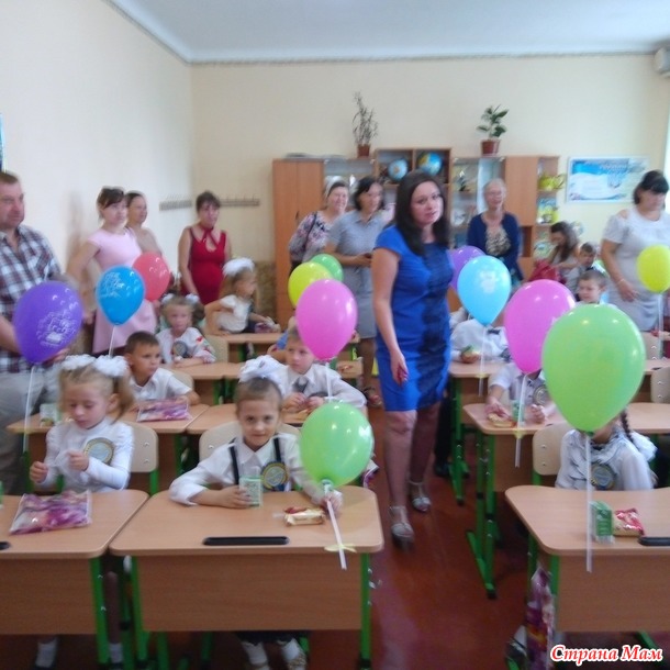 После линейки мы пошли в класс. Был урок с родителями. Учительница Галина Борисовна познакомилась с детьми, детям приготовили сладкие подарки.