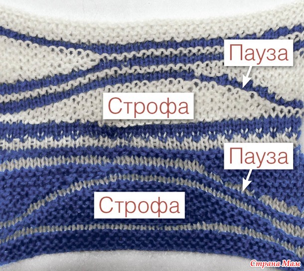 В технике свинг вязания используются два элемента- строфы и паузы.