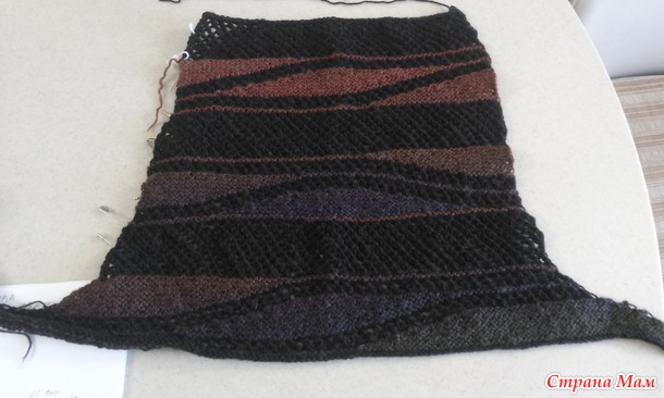 Третья свинг полоса закончилась. Теперь вяжем 22 ряда ажурной полосы.