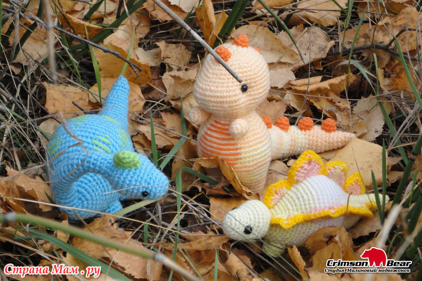 Малыши динозаврики связаны из яркой акриловой пряжи, наполнены холлофайбером. Все мелкие детали надежно пришиты. Пластиковые глазки на безопасном креплении.