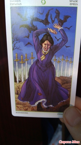 Добрый день! Сегодня мы рассмотрим карту 9 мечей. Как и в колоде Райдера Уэйта, она означает страх. Но здесь сюжет более насыщенный, и немного все же отличается. Как мы видим, на карте изображена женщина, на заднем фоне девять мечей, которые образуют как бы забор. И летучих мышей. Скорее всего, женщина живёт на своей земле, но ей захотелось посмотреть, что делается на другом участке. Она подошла к забору, хотела пройти, но тут неожиданно появились летучие мыши, женщина так испугалась, что побежала обратно, сломя голову. Здесь тоже может быть значение кошмары, как и в классическом варианте. Но более всего, это страх чего-то нового, вот решил человек что-то сделать, только приступает к осуществлению, как сразу чего-то испугался и бросил на полпути. Бывает ведь такое? Бывает. Вот об этом и говорит карта. О нерешительности, вдруг не получится, не смогу, проиграю. Например, развод. Выпадает эта карта: а вдруг я не смогу прожить без этого человека. Эти страхи находятся в подсознании человека, и очень часто он не признает, что они существуют.