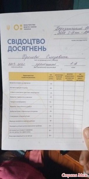 расписала все до мелочей. У нас уже каникулы, сегодня короткий день, потому что в 12 педсовет, и детей отпустили. Сейчас привычных табелей нет, есть "свідоцтво досягнень". Так как оценок нам пока не ставят, в нем есть плюсы и минусы. Вот так выглядит наше Это "оценки" за первую четверть. Пока что оценивали только общие навыки и поведение. По предметам будет уже в дальнейшем. На каникулы задали писать и по математике и по письму, просили обязательно читать с детьми.