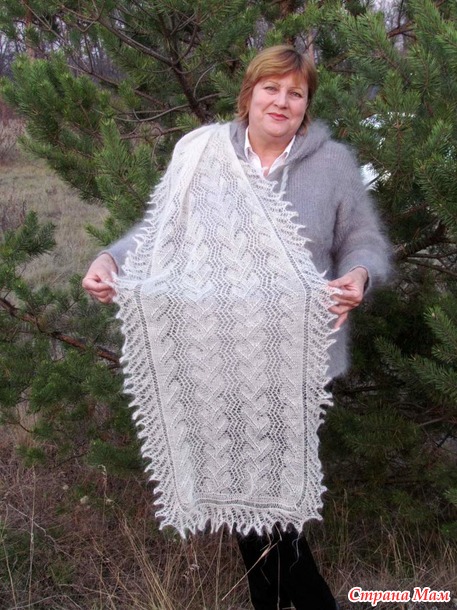 здравствуйте, дорогие мои, странамамочки! сегодня разбирала свои ярморочно-выстовочные сумки и нашла незаслуженно забытый шарфик.... постирала, расправила и отфоткала его... теперь хочу похвастаться им вам... очень нравятся рисунок ... повторяла его тысячу раз... и не надоедает... размер шарфика 160 на 40 см... связан спицами из козьего пуха...