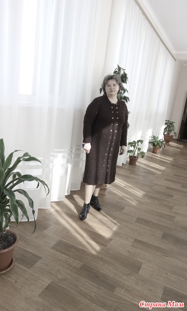 Здравствуйте страномамочки. Хочу вам сегодня показать авторскую модельку платье- пальто которое я связала из пряжи Элегант от Вита. Цвет коричневый,вязала спицами 2.5 использовала 600 гр.пряжи.