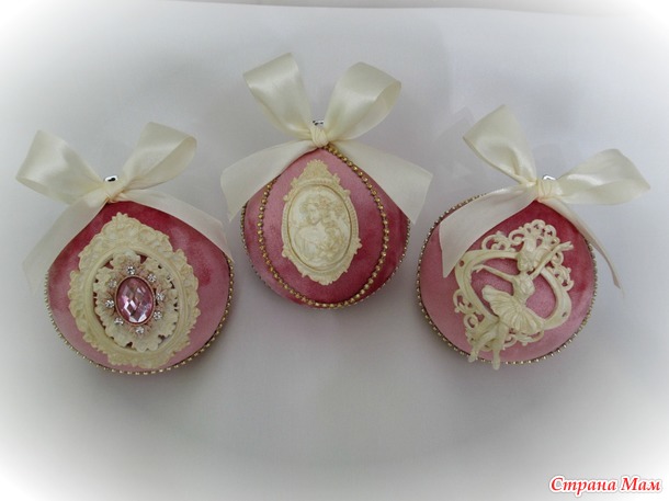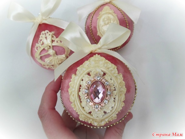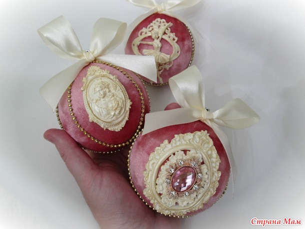 Набор состоит из трёх шариков размером 8см,каждый обтянут бархатом-крэш в цвете увядшей розы,украшен лепниной,стразовой тесьмой и брошью.