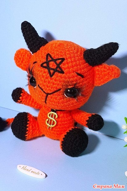 а я бы так трактовала образ второй игрушки: кроме пентаграммы, крыльев, хвоста и рогов, которые есть у первой, образ дополнен знаками, ассоциирующимися у людей со злом - деньги, знак антихриста 666, цвет пламени ада - ярко оранжевый. А мимшные глазки тоже несут свою смысловую нагрузку - образ демона детский, но всеми знаками зла. И только от нас зависит, вырастим мы своих демонов до старых матерых и бездушных или еще в зародыше спилим рожки и заменим на ангельский нимб)