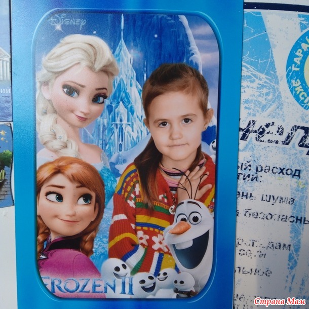 Пришли фото, которые делали в начале ноября. Если честно, мы даже не знали, что будут детей фотографировать, можно было бы понаряднее одеть. Два фото и магнит стоит 138 грн. Магнит с Эльзой и Анной, как угадал фотограф, (а может быть, спросил имя, Эльза это ведь тоже Лиза)