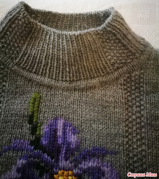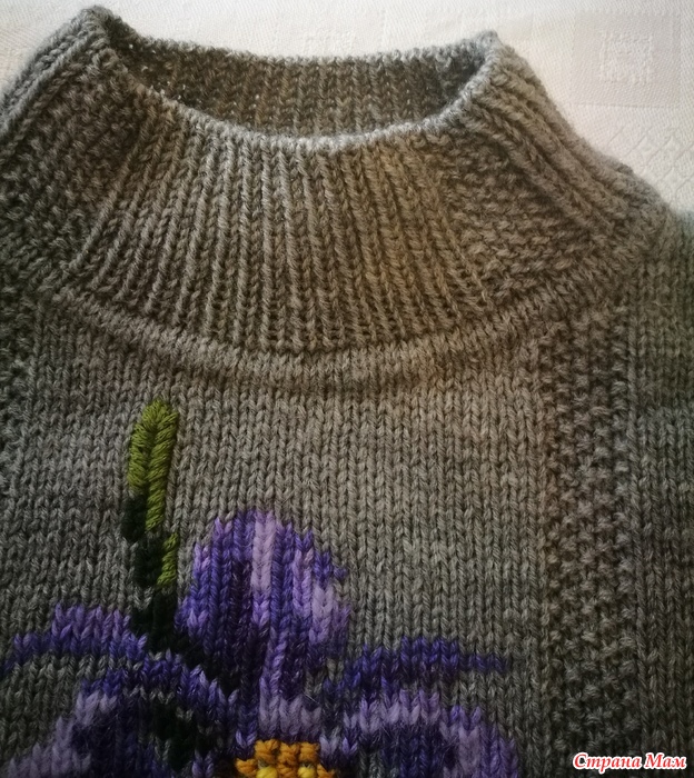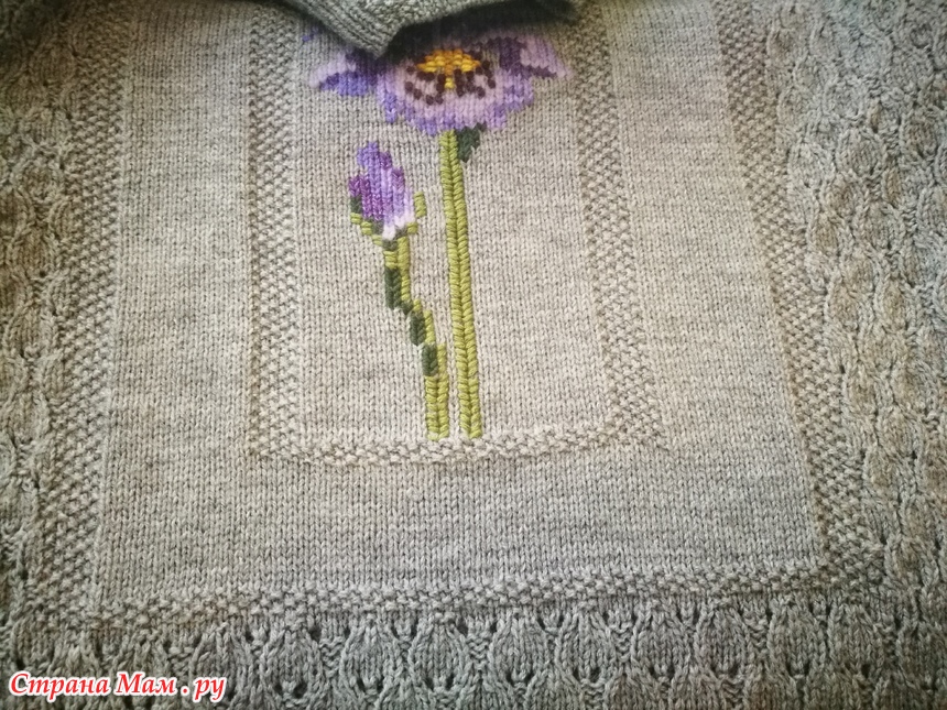 Свитер оверсайз Ирисы для внучки Танюшки. Захотела, чтобы он был очень широким. Вязание начинается с полого шнура. Горловинка обработана резинкой 1х1 со скрещенной изнаночной петлей и несколько полосочек путанки. Для того, чтобы аккуратно соединить перед и спинку с рукавами сделала небольшой подрез.Вышивка по петлям.