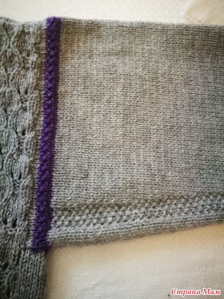 Затем из ряда, провязанного изнаночными петлями,поднять петли и вязать резинкой 1х1( это резинка со скрещенной изнаночной петлей) и несколько петель я вязала узором путанка, как и на основном изделии. Связать резинку на нужную высоту и закрыть петли иглой. Постепенно отплетать вспом.нить( предварительно отпарив эту часть бейки) и открытые петли пришивать кеттельным швом к горловине.Иглу вводить за петли провязанные с контрастной нитью.