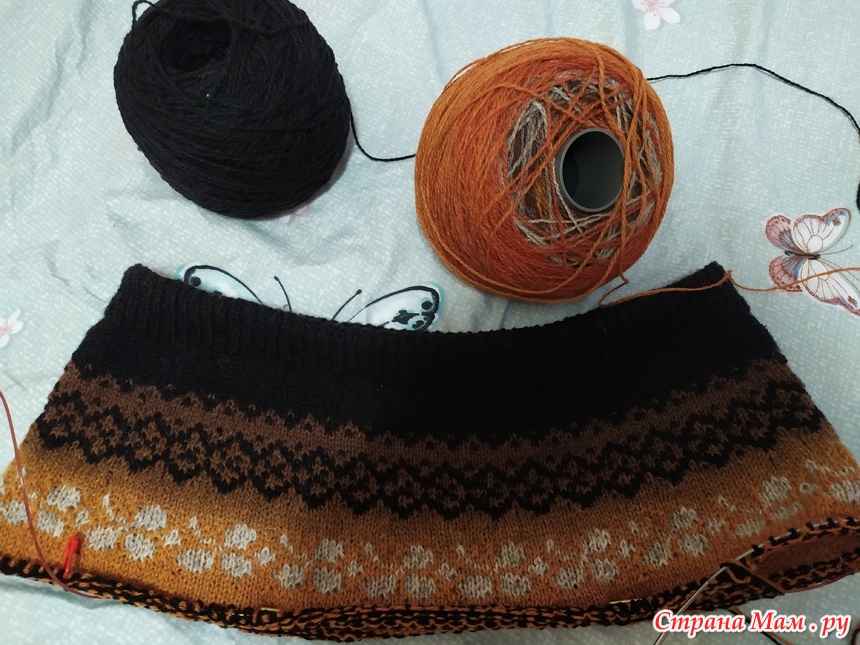 теперь о юбке : спицы № 3,5 (я вяжу туго), нитки кауни грей-оранж и черная, по 1 пасме, остались, размер у меня не маленький (52 )