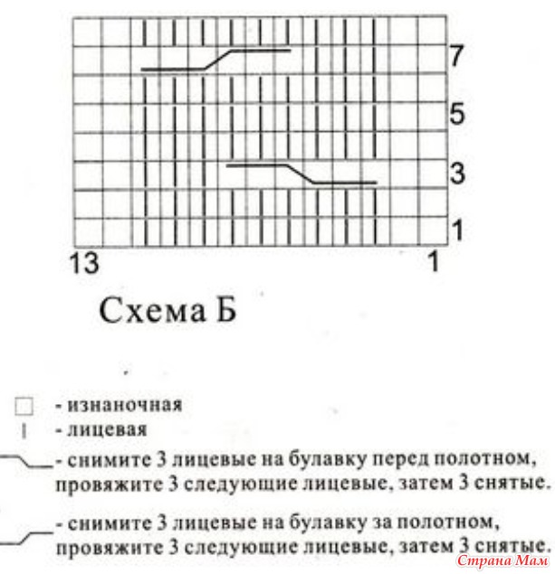 Таким образом получается - 1кром., 2 изн., 2п. узора В, 10п. узора А, 2п. узора В, 13п. узора Б, 2п. узора В, 10п. узора А, 2п. узора В, 2 изн., 13п. узора Б, 2 изн., 1 кром. = 62 петли.