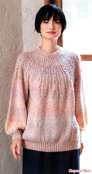 Теплый джемпер с узорчатой круглой кокеткой и накладными карманами. Спицы.