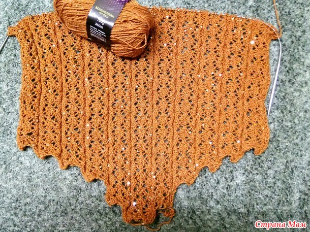 Это спинка,уже извязано 100 гр.,т.е.350 метров.Немного до скосов плеча осталось.