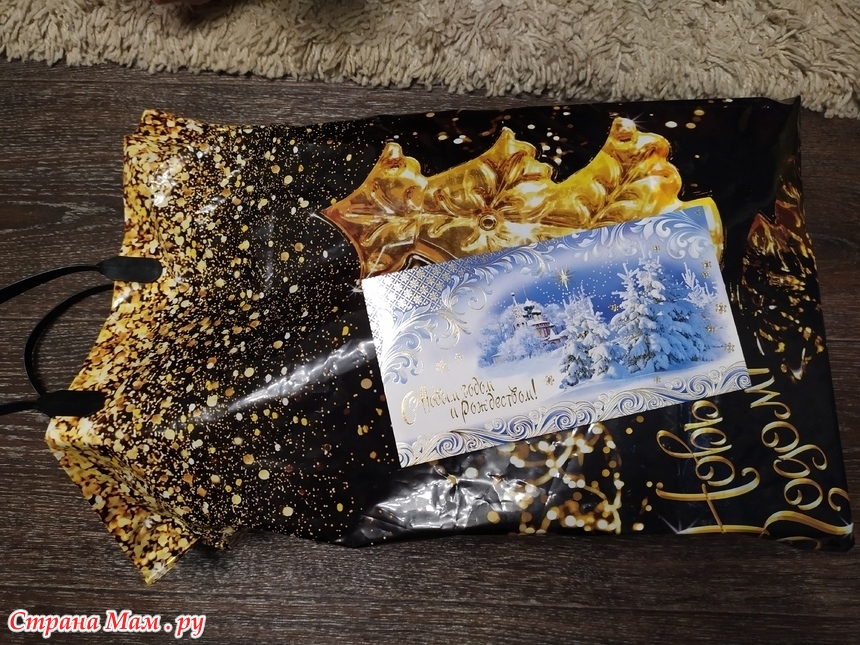 Подарок для елочки от фей Юлька_З (https://www.spletenie.ru/users/julka-z/stranamam/) добрался к нам в декабре и был сразу получен мужем на почте, после чего смиренно ждал своего часа открытия, который, к сожалению наступил только в конце года, в связи с форс-мажорной ситуацией нахождения меня в больнице. Дети вились вокруг посылки, но открывать мама запретила. И вот, наконец, этот счастливый час настал: я с малышом дома и мы открываем посылку! В посылке оказался большой новогодний пакет с подарками, сверху которого лежала новогодняя открытка с теплыми пожеланиями!