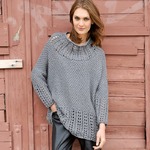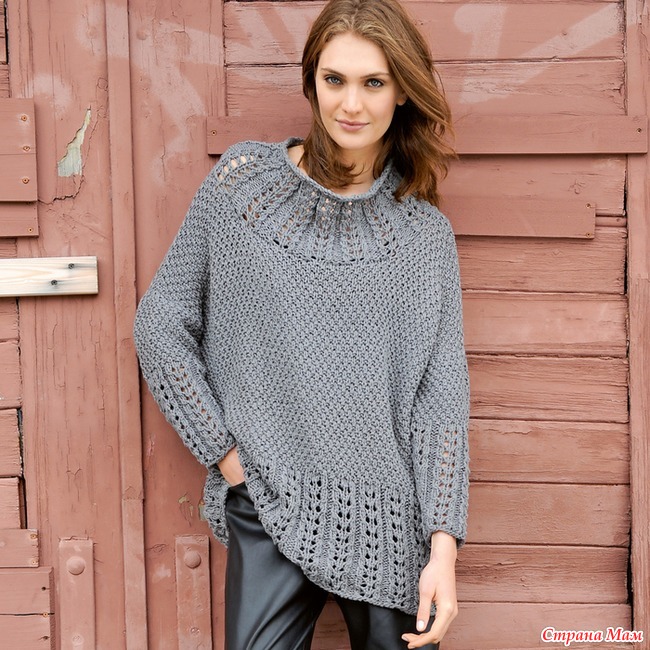 Широкие просвечивающие планки с простой, но оригинальной структурой как бы обрамляют двойной жемчужный узор. Зауженные рукава зрительно уравновешивают непринужденный силуэт.