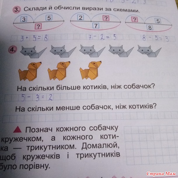 Задача про котиков и собачек. Два вопроса: на сколько больше котиков и на сколько меньше собачек. Я так понимаю, что ответ один: 5-3=2? Ведь число 2 нам вроде как неизвестно и его надо найти. По учебнику вроде бы так.
