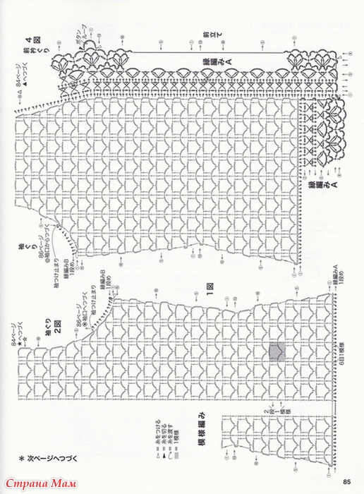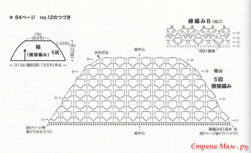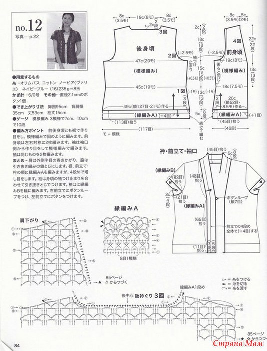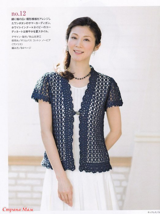 Жакет с короткими рукавами выполнен простым ажурным узором, а более плотный узор ажурной каймы двумя вертикалями визуально придаёт стройность фигуре.
