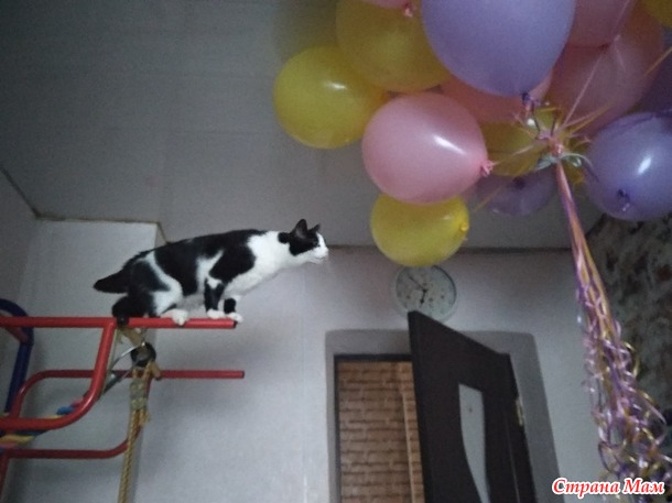 Заказали букет шариков (его доставили утром), раздербанила букет, теперь весь потолок в шариках, празднично!