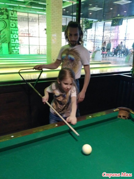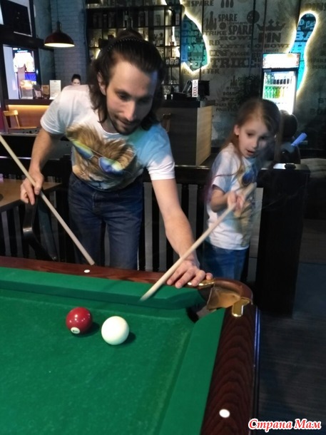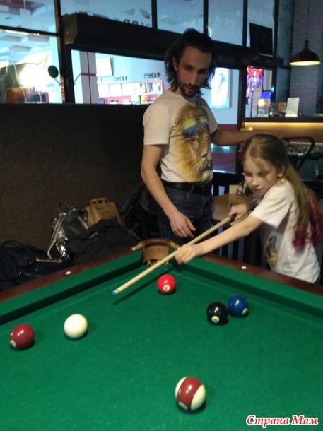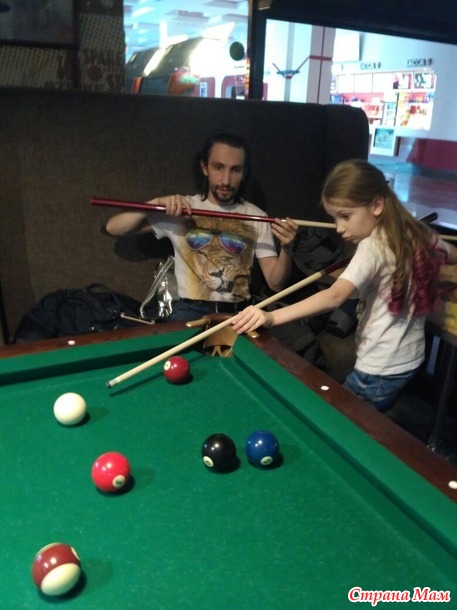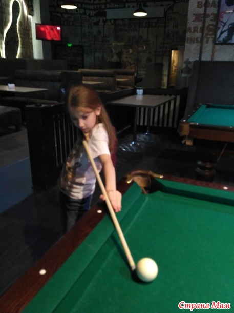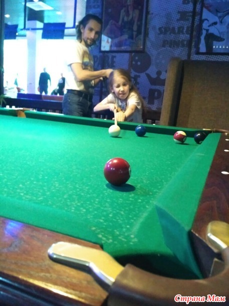 Рядом дочка увидела столы для бильярда, предложила поиграть, там вообще пустота была, чего б и нет.