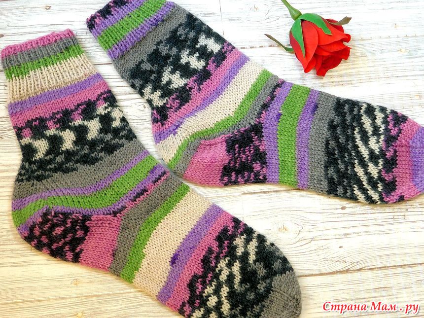 Хотелось чуть потолще ниточку. Несколько пар носков я связала, сложив Супервош в две нити. Плотно получилось толстое и теплое, но ритм секционной окраски терялся, получалась рябь, да и только: