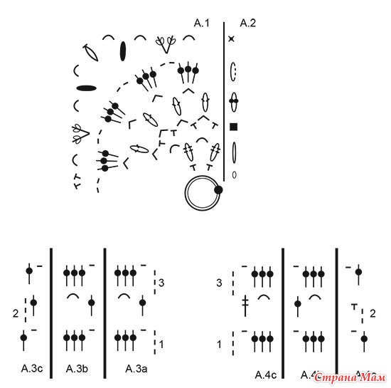 Вязать сверху вниз: начать нитью летнего луга и с ЛС.Закрепить нить с помощью 1 ст.б/н в угол, обозначенный на выкройке белой звездочкой. Вязать полосами-2 и узором первого ряда диаграмм А.3а — А.3с след. образом: вязать А.3а в первую арку, А.3b по след. 11 аркам, А.3с в угол. Далее вязать прямыми и обратными рядами, повторять последние 2 ряда диаграмм А.3а — А.3с до высоты 26 см. от квадрата — закончить после 2го ряда диаграмм.