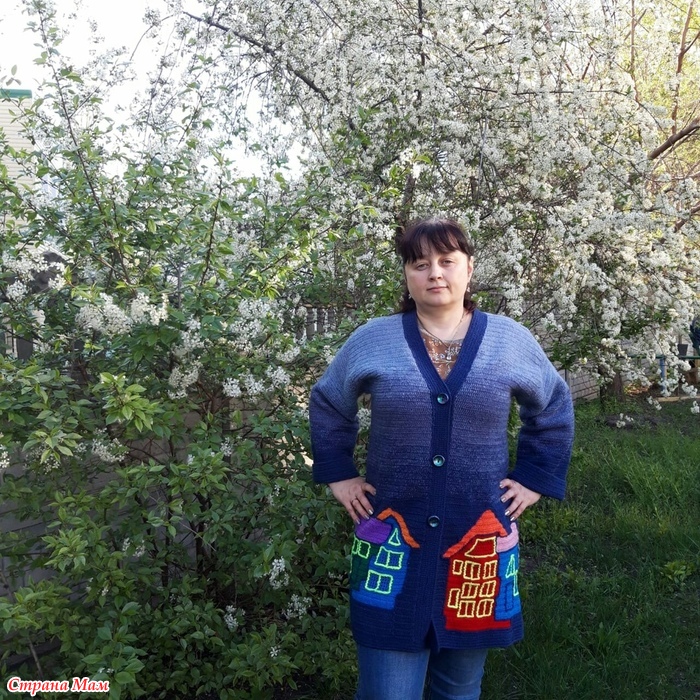 Сначала связала полосу домиков, а потом вокруг них вязала кардиган.