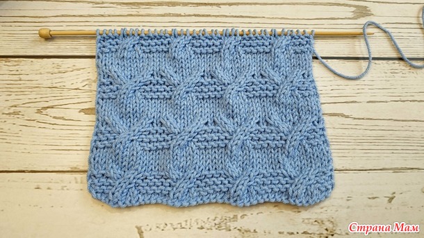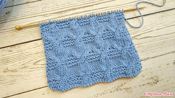 Ряд 9: кром. п, *1 лиц, 1 п оставить на дополнительной спице за работой, 2 лиц, затем петлю с дополнительнойспицы провязать лиц , 2 лиц,2 п оставить на дополнительной спице перед работой, 1 лиц, затем петли с дополнительной спицы провязать лиц*, кром. п;