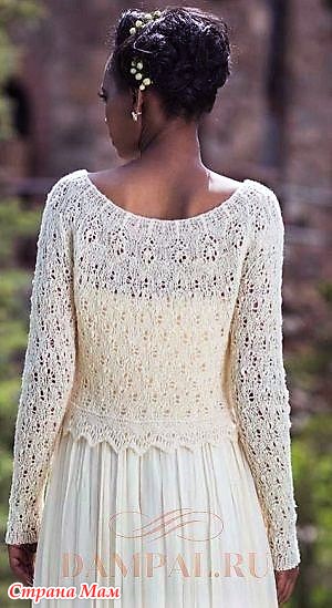 Вязаная ажурная кофточка с зубчатой каймой по краям имеет круглый вырез горловины и выглядит очень женственно.