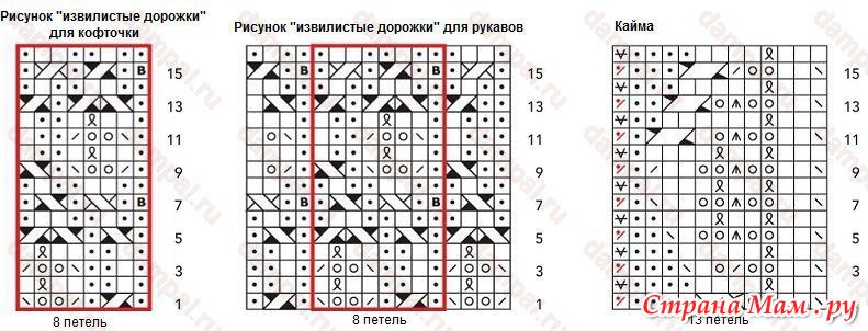 Следующий круговой ряд: как только закончиться раппорт предыдущего рисунка, начать вязать по схеме рисунка «извилистые дорожки» для рукавов до последней петли, 1 изнаночная петля.