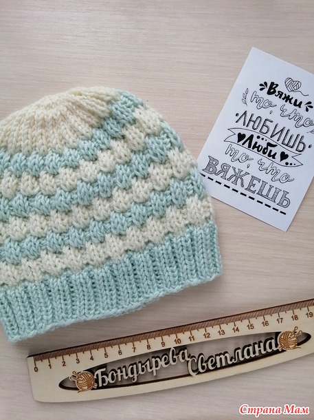 Вышли с дочкой погулять. И я не долго думая взяла спицы, моток пряжи и родилась такая шапочка. Довязала я её конечно же дома
