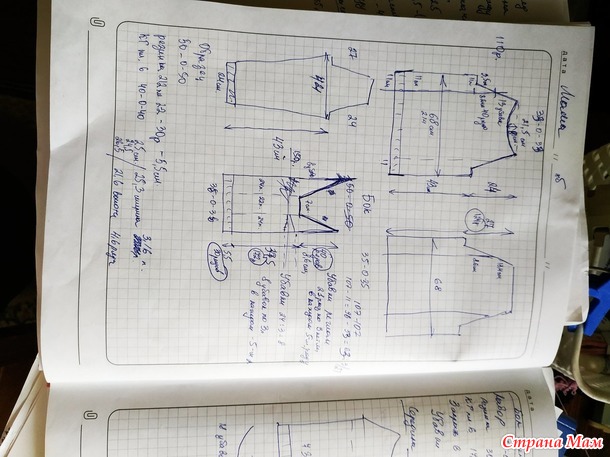 Кому интересно вот мои записки сумасшедшего, что бы понятно как выкройку делила. Но я сначала посчитала без деления расчёт для вязания, потом "разрезала" и потом добавляла петлю на шов и вязала, что бы линия реглана вышла красивой и одного наклона.