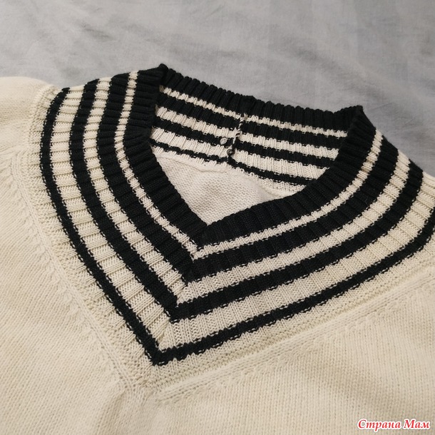 В итоге получилось, что тело свитера из 4 деталей - два бочка, и середина переда и спинки. Ну а ширина по переда бесконечно большая 68см.