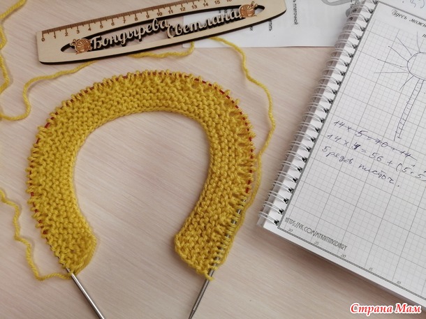 Связано 35 рядов. Места помеченные маркерами буду вязать платочной вязкой и далее закрою рукава