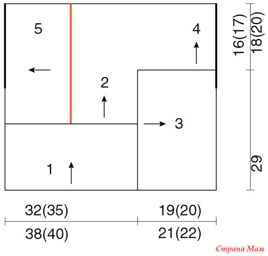 Топ состоит из 2 одинаковых деталей. На схеме отражены 5 шагов для выполнения одной из деталей. Стрелки на схеме указывают направление вязания.