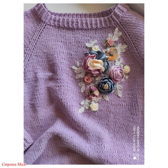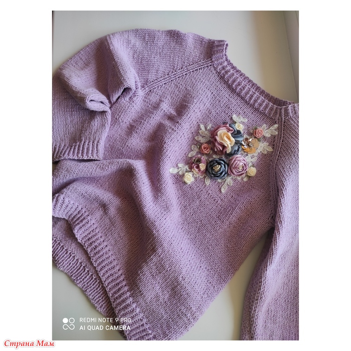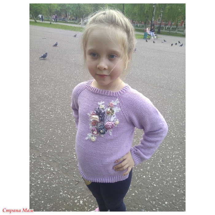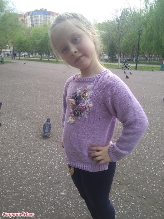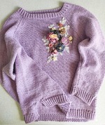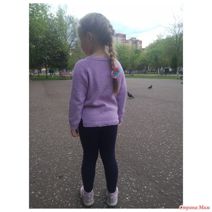 В этот раз связала свитер из пряжи фиолетового цвета, пряжа из Троицка "Жасмин", на размер 130-132 расход 4мотка, спицы #2,5 и #3.