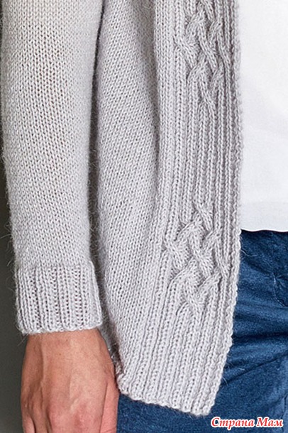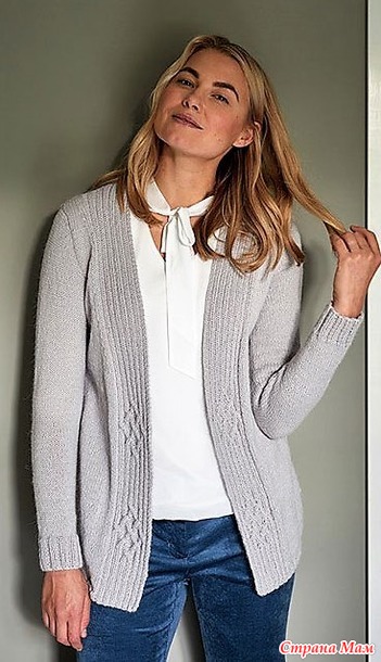 Кардиган с рельефным узором на широких полочках. Спицы.