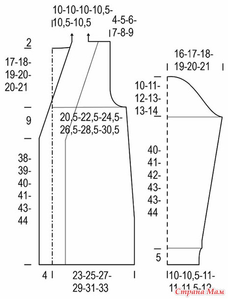 Набрать 42 (44) 46 (46) 48 (50) п. и выполнить 5 см резинкой 2х2, далее продолжить чулочной вязкой. Через 9 (7) 12 (8) 14 (13) см от наборного края начать прибавления по 1 п. с каждой стороны. Повторить ряд прибавлений через каждые 3 (3) 2.5 (2.5) 2 (2) см всего 11 (12) 13 (15) 16 (17) р. = 66 (70) 74 (78) 82 (86) п. Через 45 (46) 47 (48) 48 (49) см от наборного края для оката рукава закрыть 4 (5) 5 (6) 7 (8) п. в начале след. 2-х рядов, 3 п. в начале след. 2-х рядов, 2 п. в начале след. 4-х рядов, потом закрыть в каждом 2-ом ряду с обеих сторон по 1 п. 8 (9) 10 (11) 11 (12) р., 2 п. 1 раз, 3 п. 1 раз. Закрыть оставш. петли.
