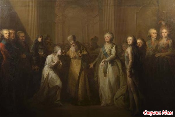 Однако она изображает не самую церемонию, а предшествующий эпизод — переход Луизы в православие и принятие ею имени Елизавета Алексеевна.