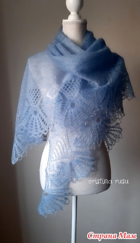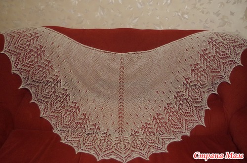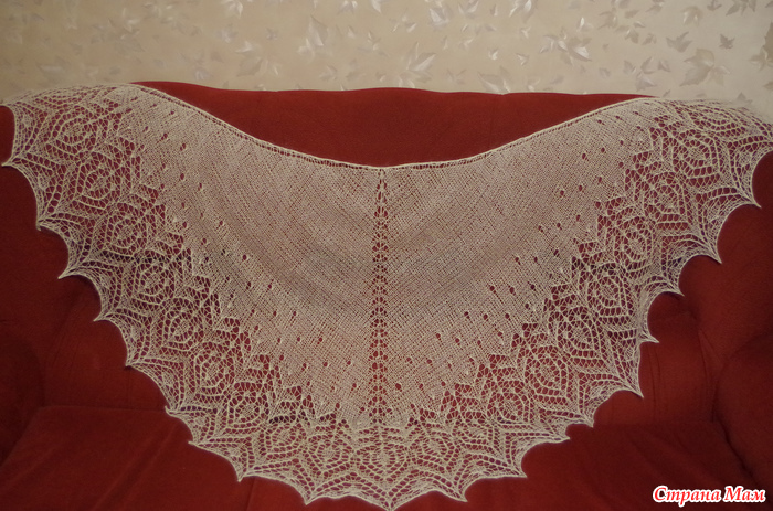 Вяжется как обычная треугольная шаль с центральной петлёй сверху вниз, от ленточки к кайме.