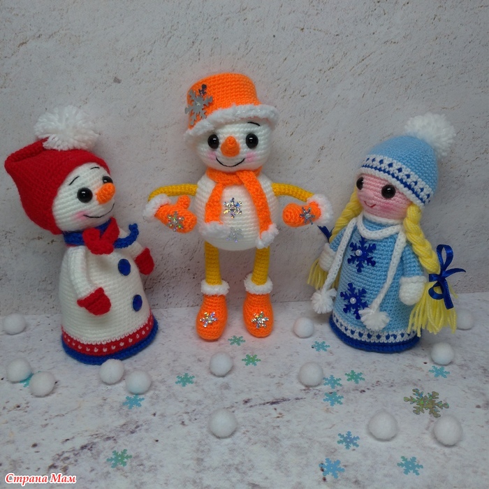 Малыши связаны из детской новинки, крючок 2, рост 15 см, у Снеговичка 17 см, безопасные глазки, у Снеговичка ручки и ножки каркасные.