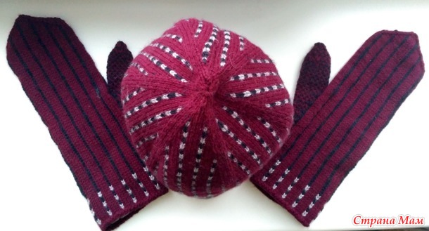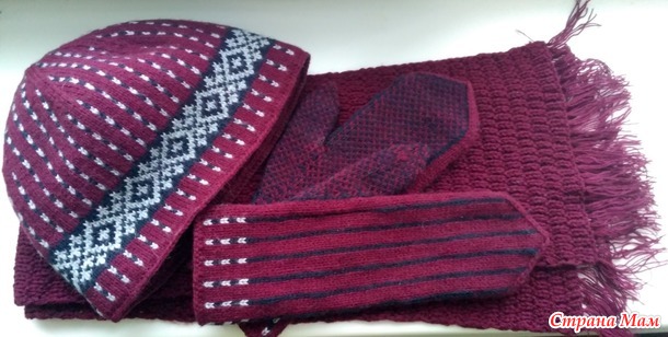 Связался у меня из неопознанной полушерсти комплект с жаккардом. Нитка примерно 1200м в 100 г, вязала в четыре сложения спицами №2,5, а шарф спицами №3,5.