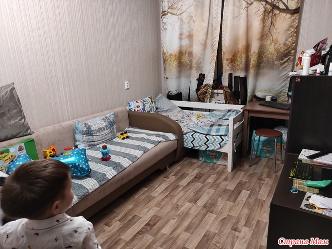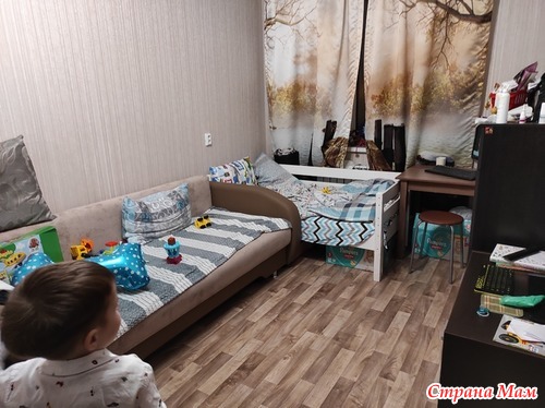 Разместились пока, в комнате был большой шкаф купе, поставили кровать старшего ребенка, нам диван (младший пока спит с нами, его кроватку разобрали), стол для компьютера, комод, и тумбочка/комод для телевизора. СТоит еще кресло Икеевское, там кормлю младшего, как откажемся от гв, кресло можно убрать и поставить кроватку вторую.