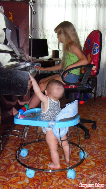 Приготовление уроков, вернувшейся домой, старшей дочерью, еще больший экстрим, чем кормление. Она тоже как заправский виртуоз пишет то стоя, то сидя, перемещаясь с тетрадкой по всем поверхностям квартиры. Урок на фортепиано они тоже делают вместе, сын помогает ей на басах. Все мои попытки отвлечь его в это время безуспешны, я надоела ему за день, и он требует свежего общения от сестрёнки.