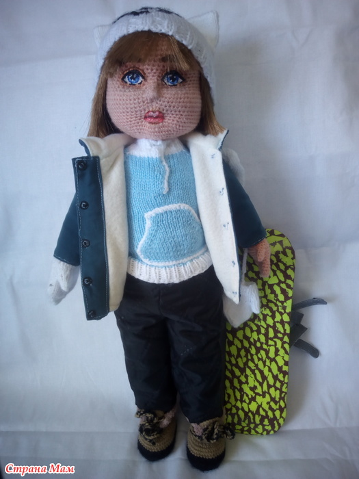 и чуть не забыла про сноуборд (он сделан из запекаемой полимерной глины(точнее из разных цветных остатков) крепление из искусственной кожи на пришивных кнопках.