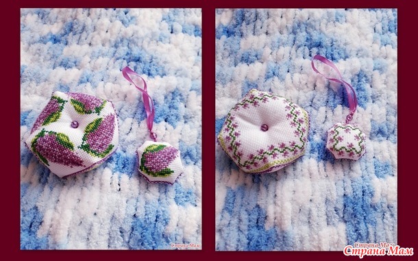 Оля закончила вышивать и оформила бискорню. Получился комплект.