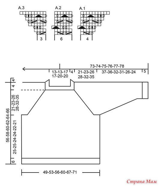 Продолжить вязание по схемам без дальнейших прибавок; петли, которые не попадают в схему, вязать лицевой гладью. Продолжить работу, пока высота детали не составит 21-23-26-28-32-35 см от маркера на горловине.