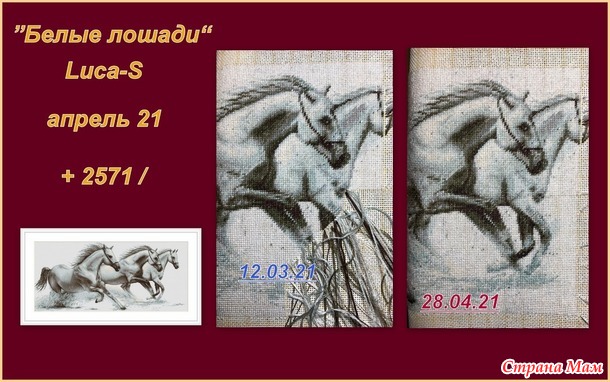 Основной мой процесс - "Белые лошади" от Luca-S продвинулся очень хорошо - почти закончила последнюю лошадку и стало много белого фона. А он вышивается очень легко, но не скучно за счет того, что гобеленовый стежок по разному вышивается при проходе вправо и влево.
