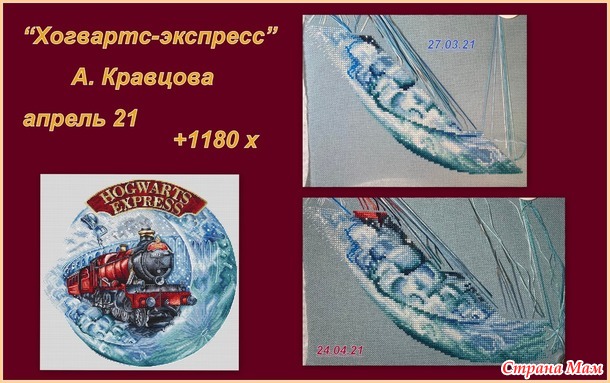 В этом проекте у меня участвуют 2 процесса. "Весенний домик" от Анны Кузнецовой я вам уже показала. "Хогвартс-экспресс" от Анастасии Кравцовой продвигается не очень быстро, но каждую неделю стараюсь немного повышивать, чтобы не зарабатывать штрафных очков для команды дизайнера.